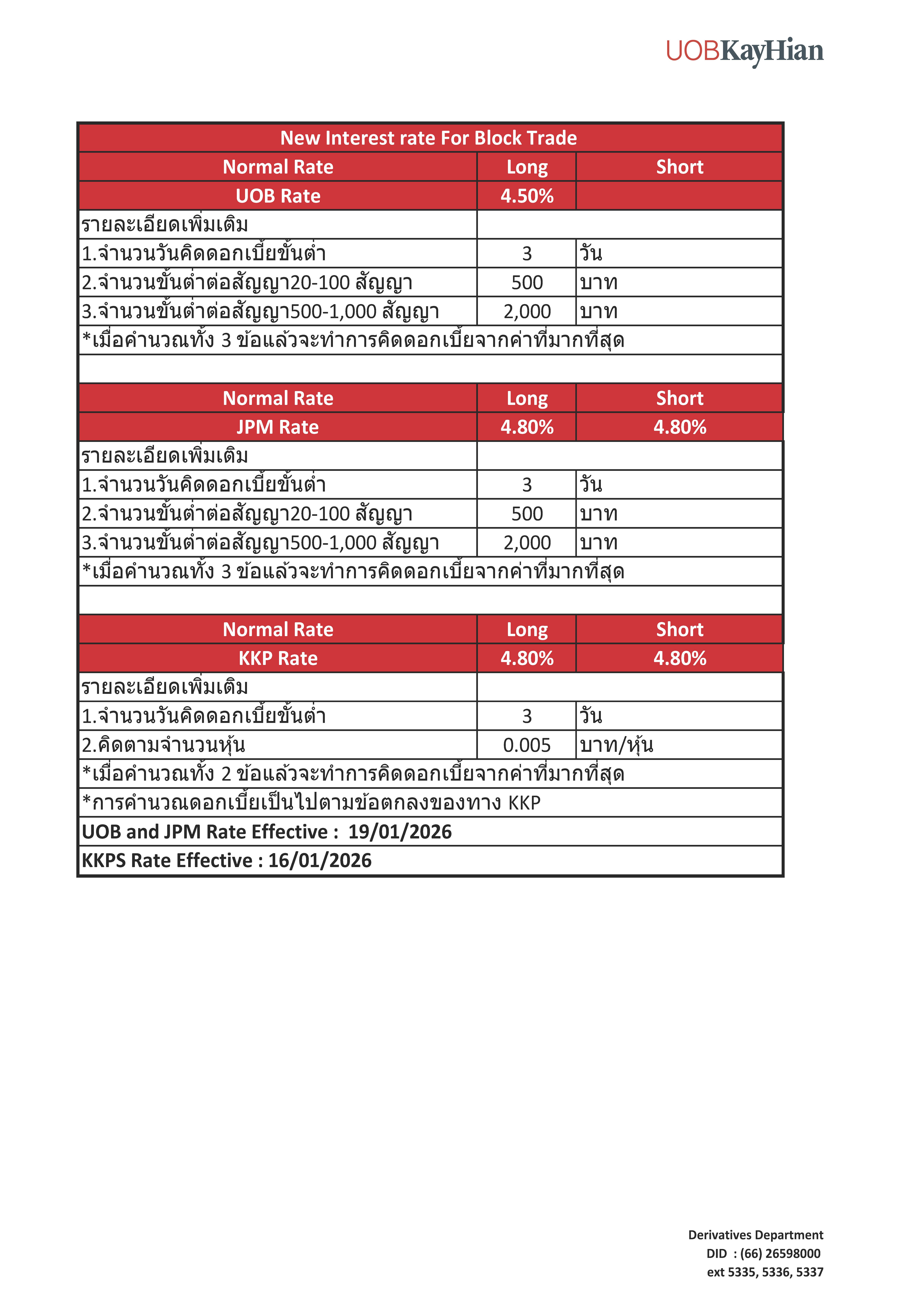 เอกสารอัตราดอกเบี้ยสำหรับบริการ Block Trade ของบริษัทหลักทรัพย์ ยูโอบี เคย์เฮียน (ประเทศไทย)