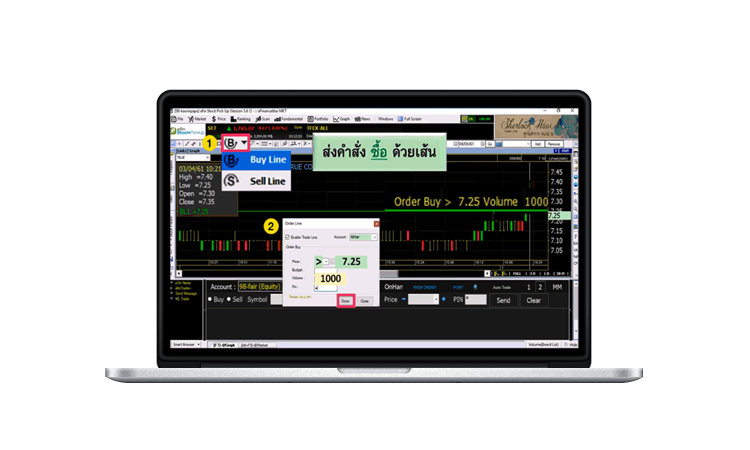 เส้นสำหรับตั้งส่งคำสั่งซื้อขายหุ้นบนกราฟเทคนิค ผ่านโปรแกรม eFin StockPickUp แบบเรียลไทม์